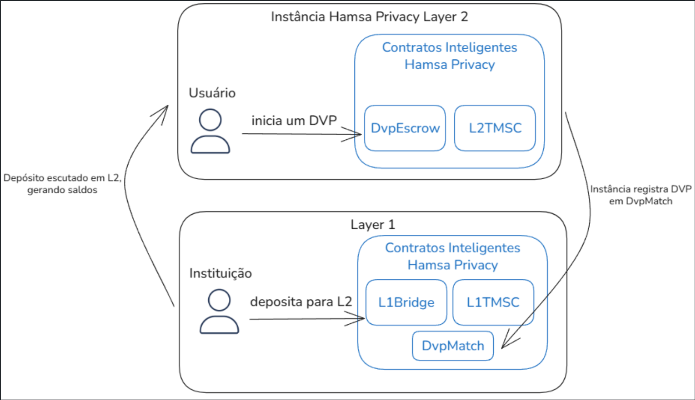 A arquitetura inclui contratos que coordenam os fluxos entre Layer 1 e Layer 2, habilitando depósitos, saques, custódia temporária e finalização dos DVPs. São eles: